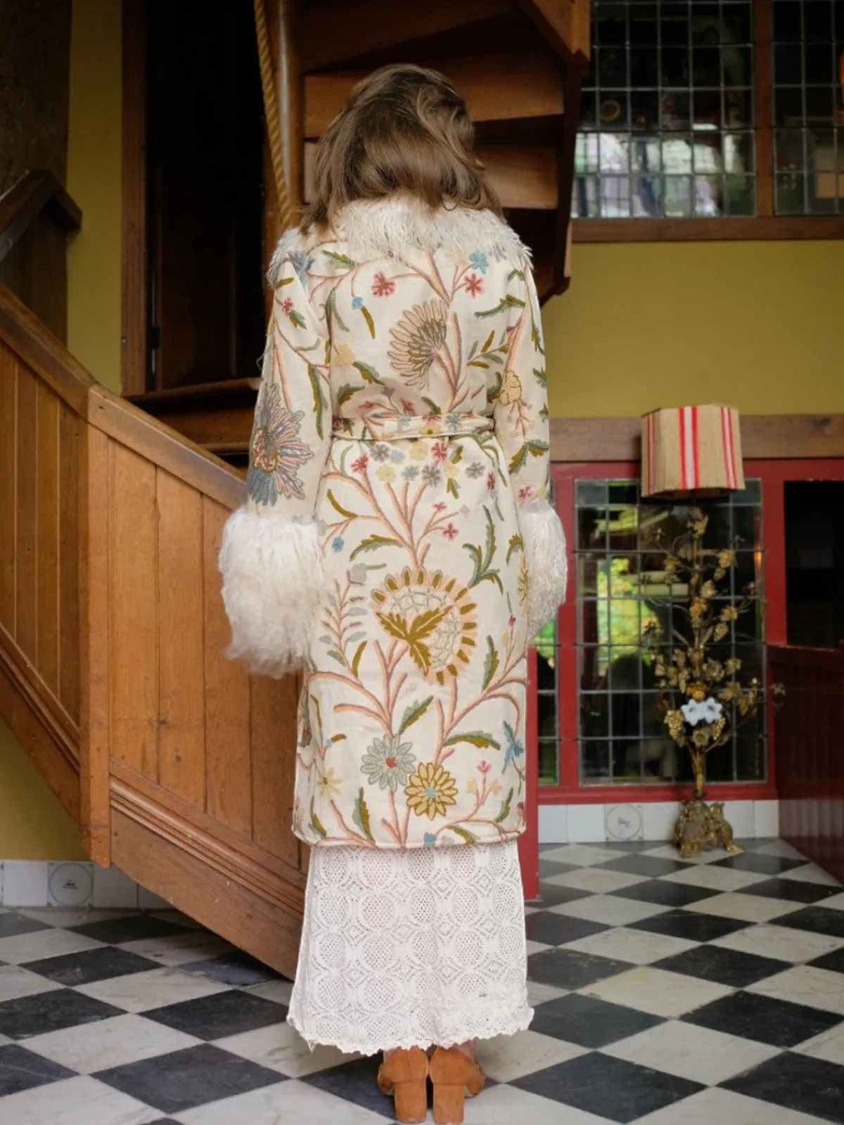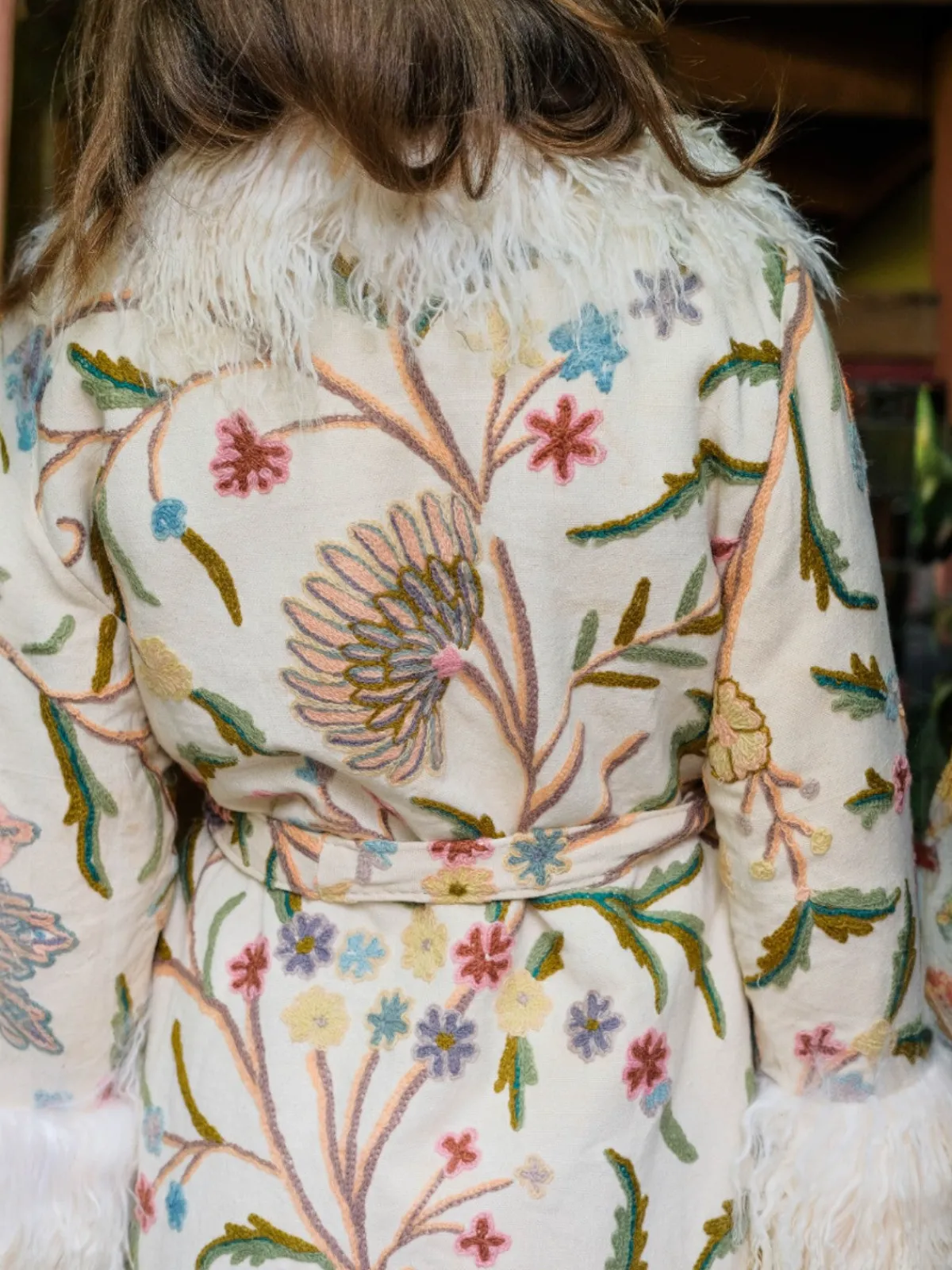 Our ZAZI Aisara Wrap Coat in Multi/Ivory epitomizes the artistry and dedication of skilled women, with each piece showcasing meticulous craftsmanship. Infused with a distinct 70s allure, it is expertly handcrafted from curated vintage velvet suzani embroidery, intricately woven with upcycled sheepskin, and finished with a luxurious fur trim. With two front pockets, vintage button closure, and a removable belt, this stunning coat will turn heads. Given the vintage nature of the textiles, each coat is entirely one-of-a-kind and only available in the indicated size. Handcrafted by female artisans in Afghanistan.