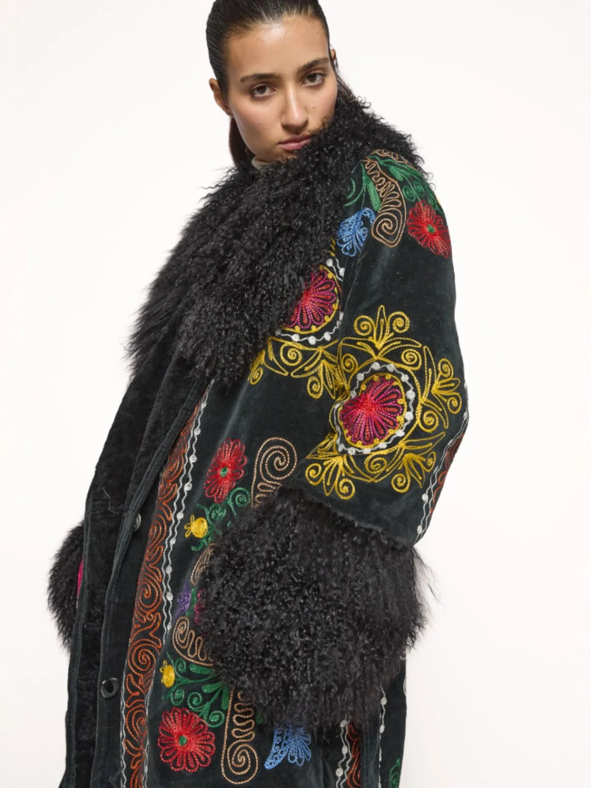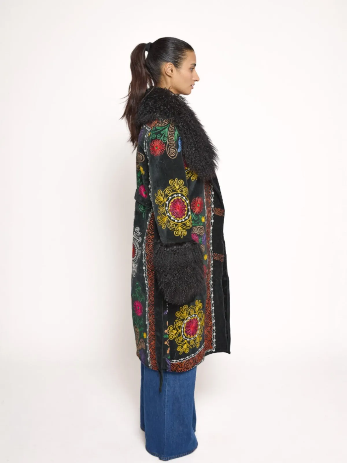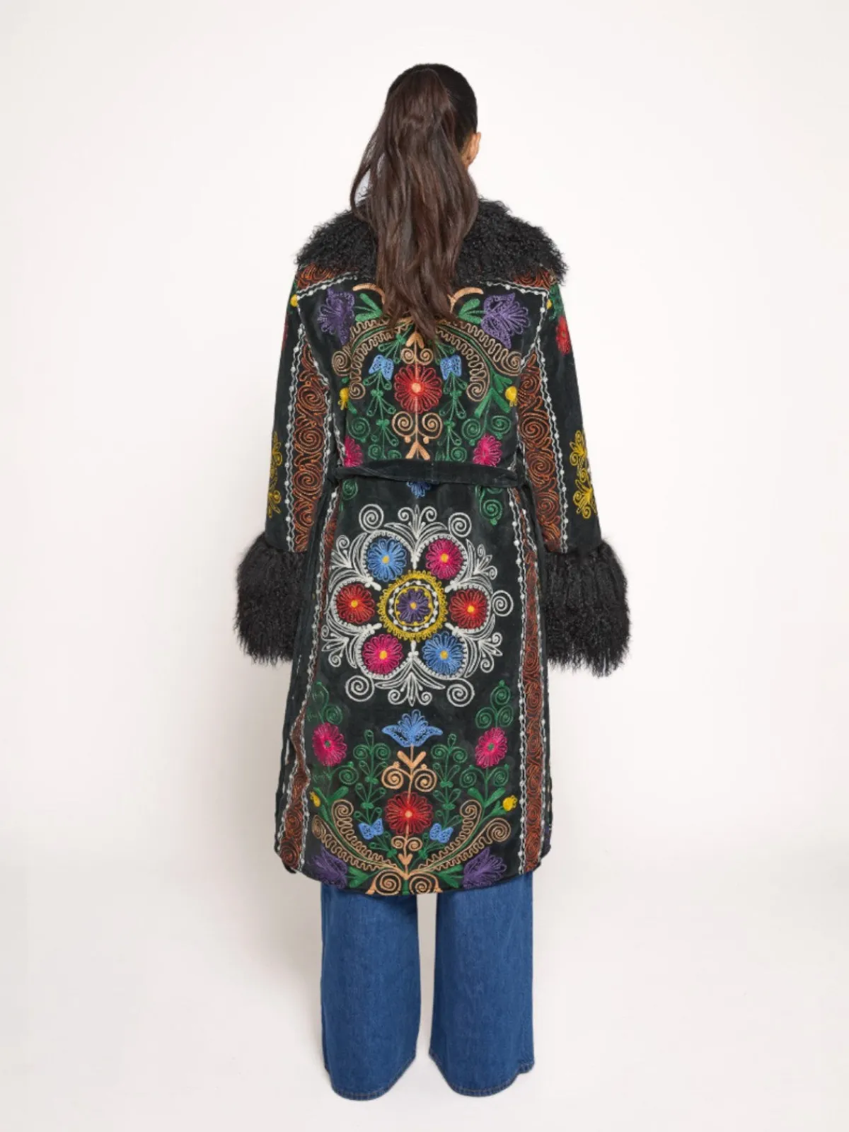 Our ZAZI Aisara Wrap Coat in Multi Print/Black epitomizes the artistry and dedication of skilled women, with each piece showcasing meticulous craftsmanship. Infused with a distinct 70s allure, it is expertly handcrafted from curated vintage velvet suzani embroidery, intricately woven with upcycled sheepskin, and finished with a luxurious fur trim. With two front pockets, vintage button closure, and a removable belt, this stunning coat will turn heads. Given the vintage nature of the textiles, each coat is entirely one-of-a-kind and only available in the indicated size.Handcrafted by female artisans in Afghanistan.