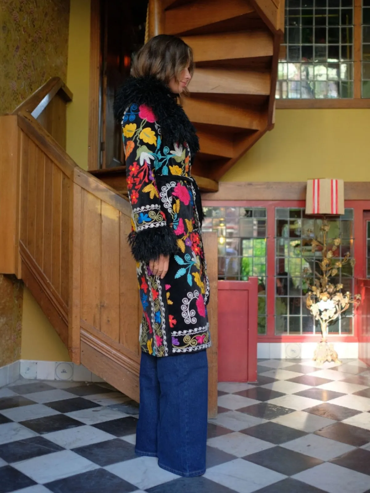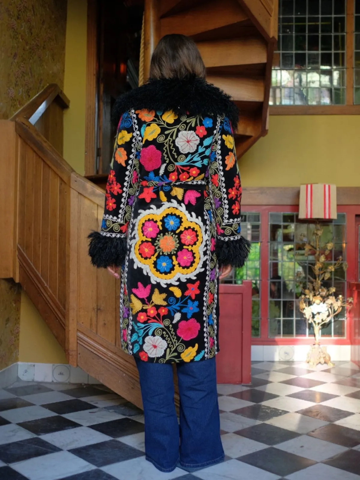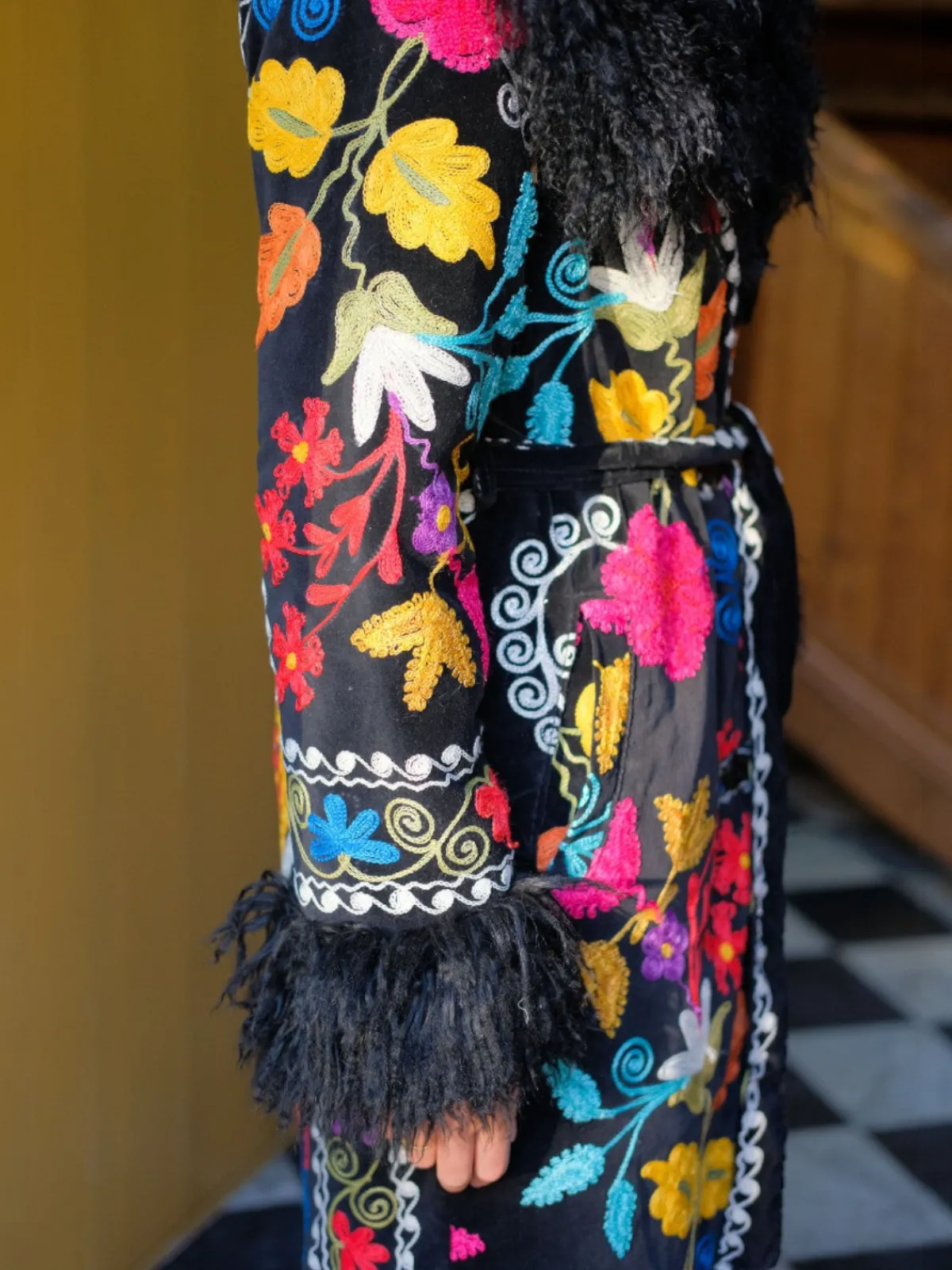 Our ZAZI Aisara Wrap Coat epitomizes the artistry and dedication of skilled women, with each piece showcasing meticulous craftsmanship. Infused with a distinct 70s allure, it is expertly handcrafted from curated vintage velvet suzani embroidery, intricately woven with upcycled sheepskin, and finished with a luxurious fur trim. With two front pockets, vintage button closure, and a removable belt, this stunning coat will turn heads. Given the vintage nature of the textiles, each coat is entirely one-of-a-kind and only available in the indicated size.Handcrafted by female artisans in Afghanistan.