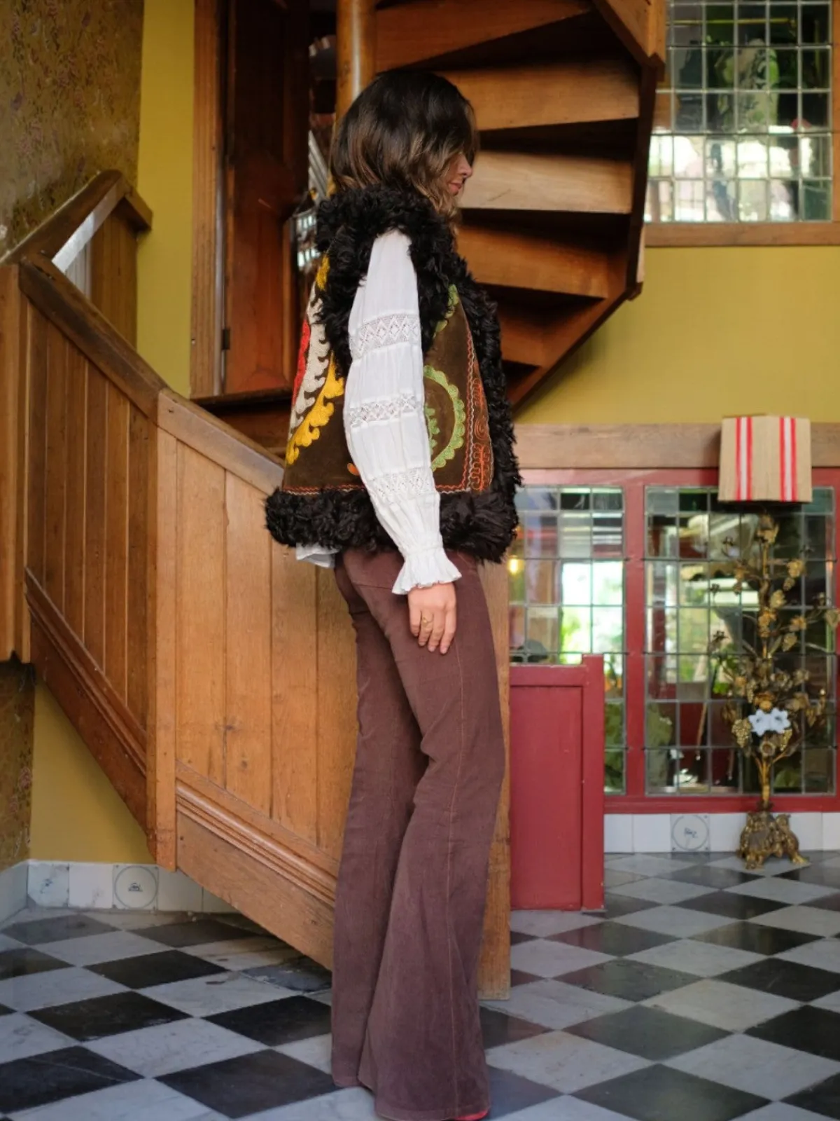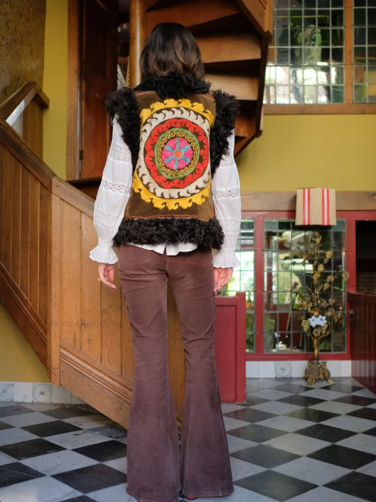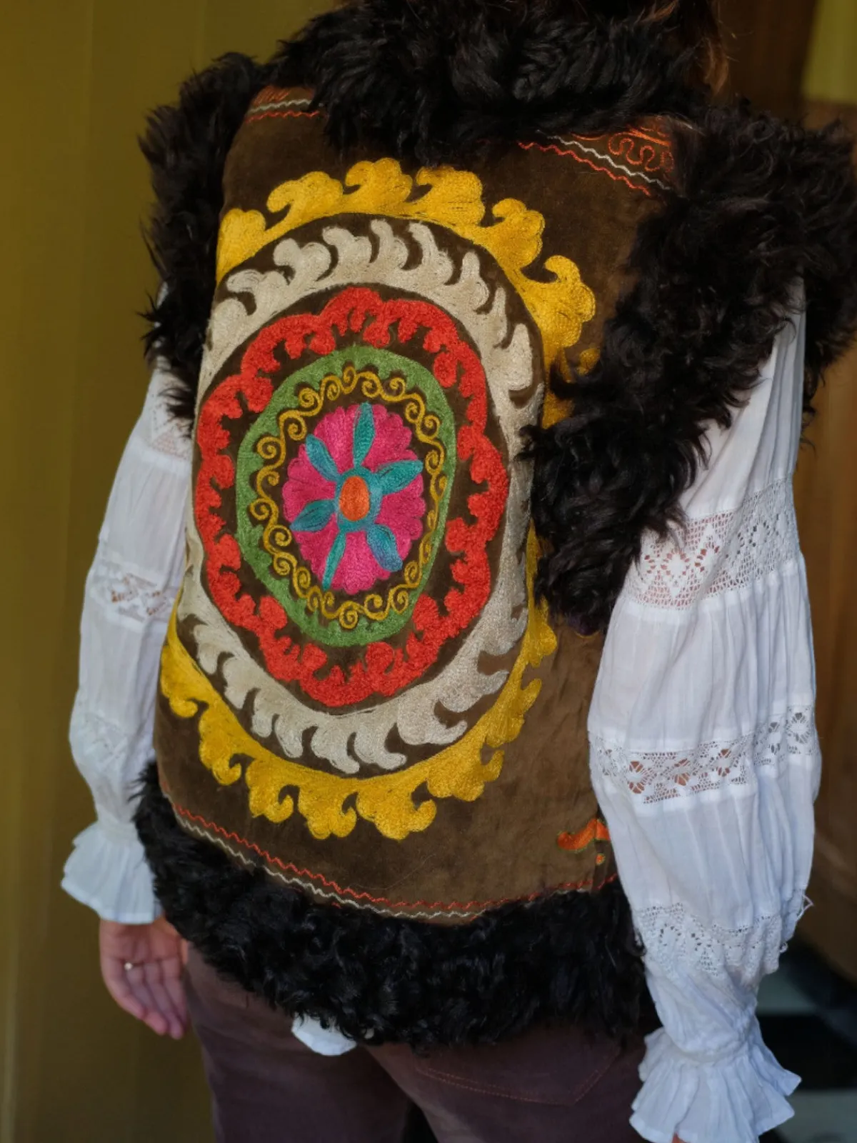 Our ZAZI Aziz Waistcoat in M/L is a meticulously crafted vest, adorned with intricate hand embroidery and a captivating print that showcases the opulence of Suzani velvet. Thoughtfully designed with two front pockets, it is elegantly finished with a sumptuous fur trim, blending artisanal heritage with refined sophistication.Given the vintage nature of the textiles, each coat is entirely one-of-a-kind and only available in the indicated size. Handcrafted by female artisans in Afghanistan.