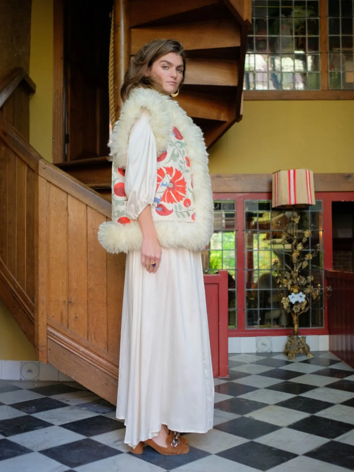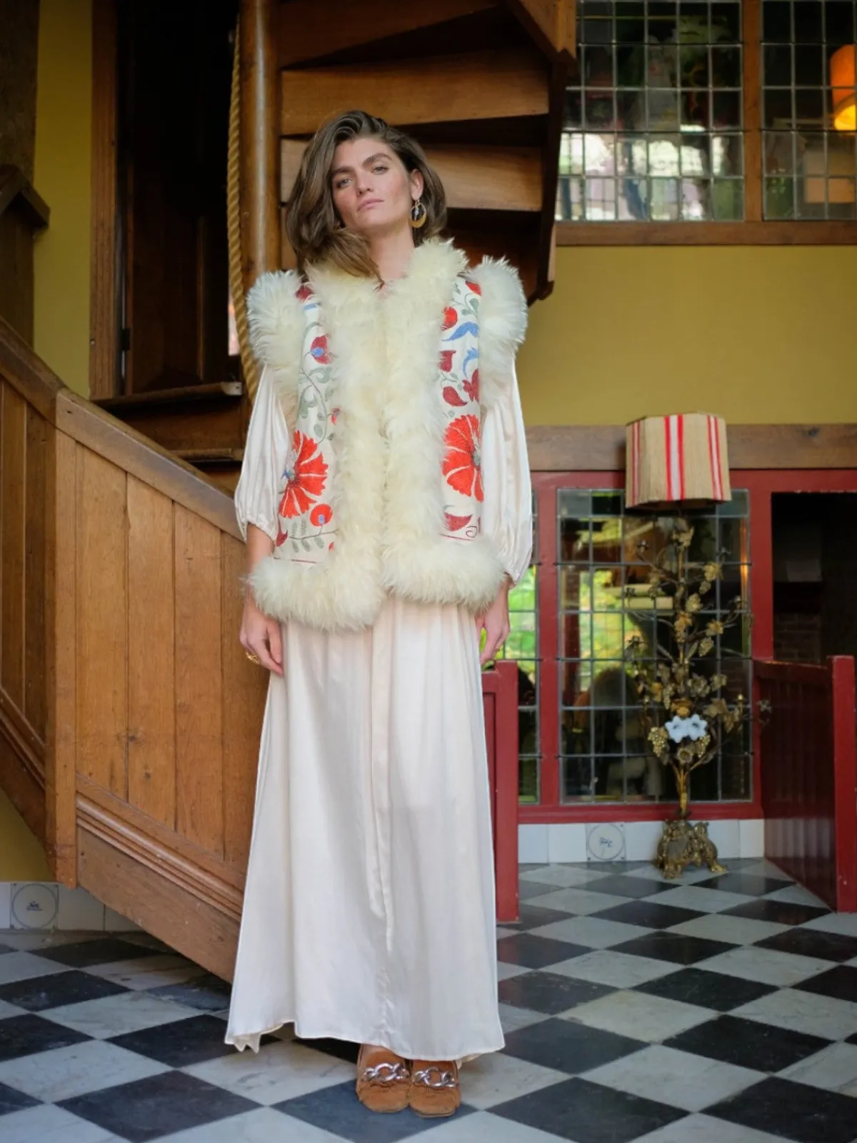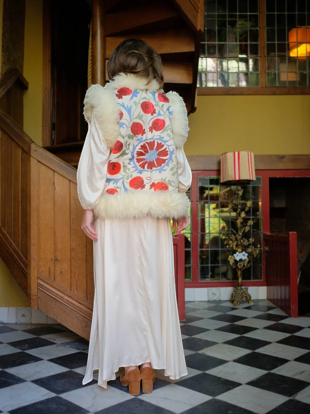 Our ZAZI Aziz Waistcoat is a meticulously crafted vest, adorned with intricate hand embroidery and a captivating print, showcases the opulence of Suzani velvet. Thoughtfully designed with two front pockets, it is elegantly finished with a sumptuous fur trim, blending artisanal heritage with refined sophistication. Given the vintage nature of the textiles, each coat is entirely one-of-a-kind and only available in the indicated size. Handcrafted by female artisans in Afghanistan.