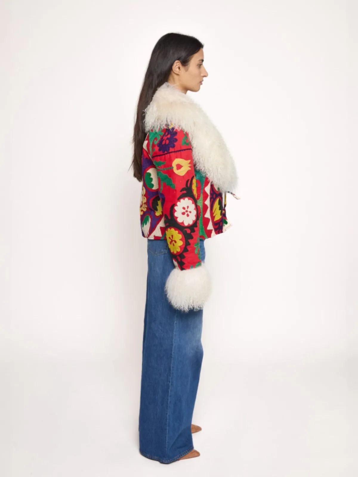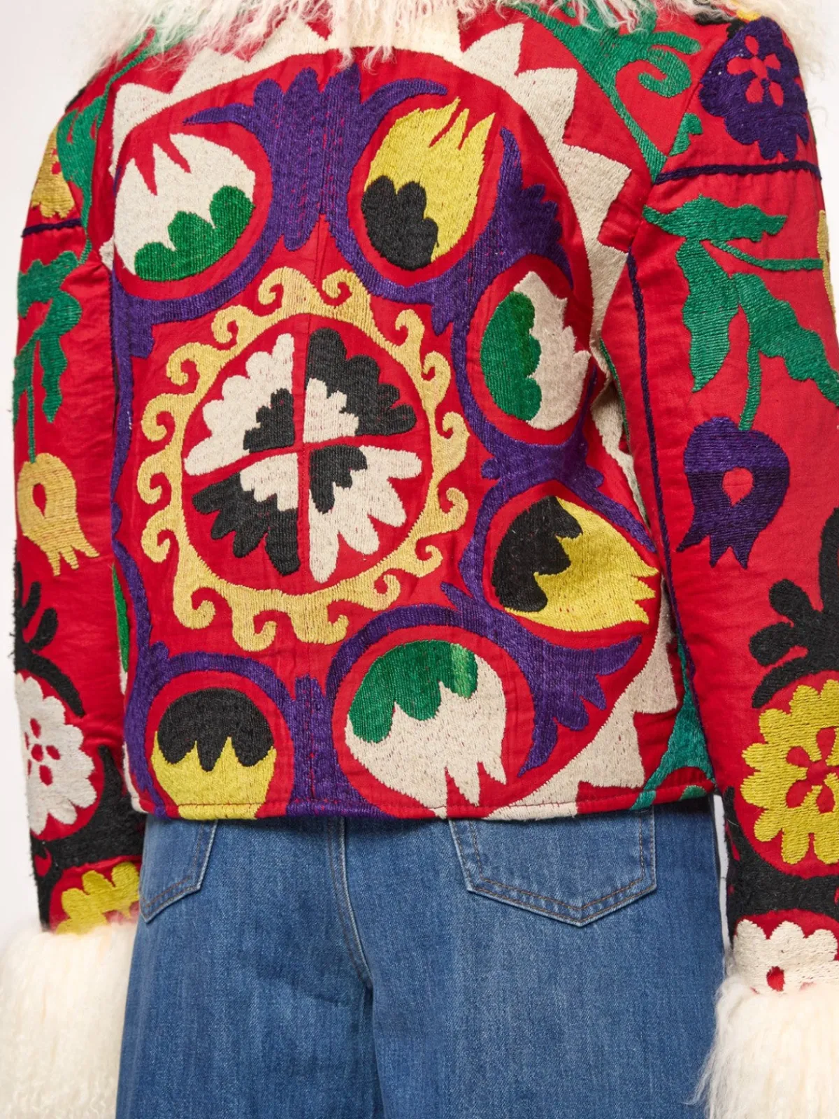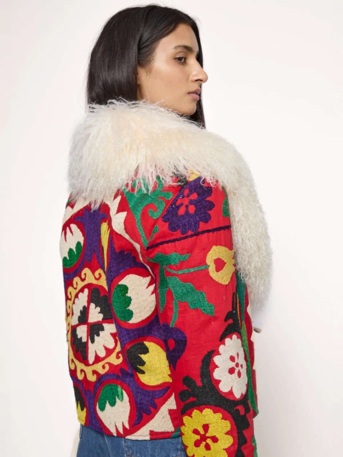 Our ZAZI Madina Coat is a short printed coat that is a celebration of meticulous craftsmanship and collaboration, thoughtfully created by the skilled hands of women. Infused with a distinct 70s vibe, each piece is handcrafted from curated vintage suzani embroidery, seamlessly interwoven with upcycled sheepskin, and finished with an opulent fur trim, making it a truly timeless statement. Two front pockets add utility to a truly gorgeous piece, while the hidden button and ribbon closure allow for an elegant fit. Given the vintage nature of the fabrics, each coat is one-of-a-kind and only available in the size provided. Handcrafted by female artisans in Afghanistan.