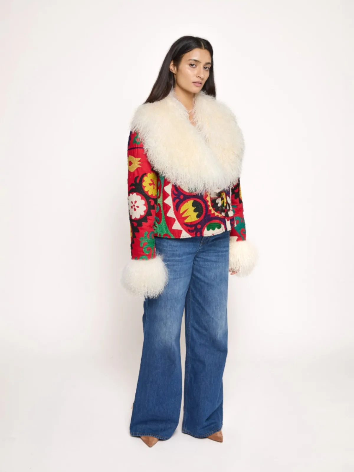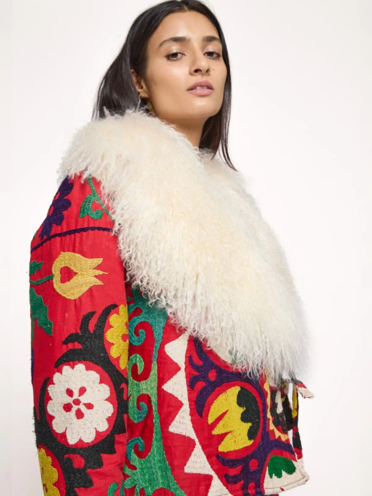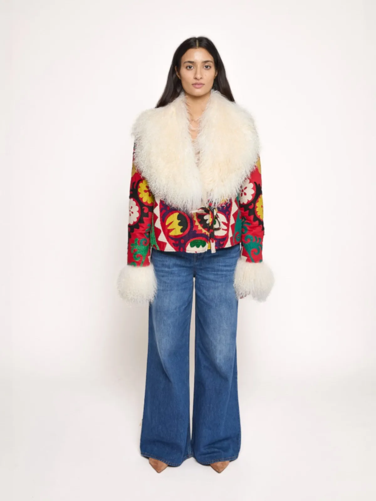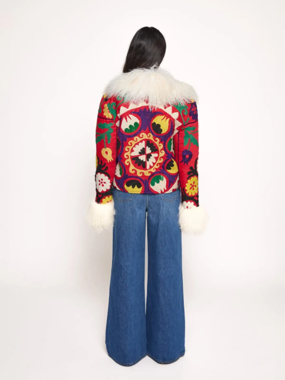 Our ZAZI Madina Coat is a short printed coat that is a celebration of meticulous craftsmanship and collaboration, thoughtfully created by the skilled hands of women. Infused with a distinct 70s vibe, each piece is handcrafted from curated vintage suzani embroidery, seamlessly interwoven with upcycled sheepskin, and finished with an opulent fur trim, making it a truly timeless statement. Two front pockets add utility to a truly gorgeous piece, while the hidden button and ribbon closure allow for an elegant fit. Given the vintage nature of the fabrics, each coat is one-of-a-kind and only available in the size provided. Handcrafted by female artisans in Afghanistan.
