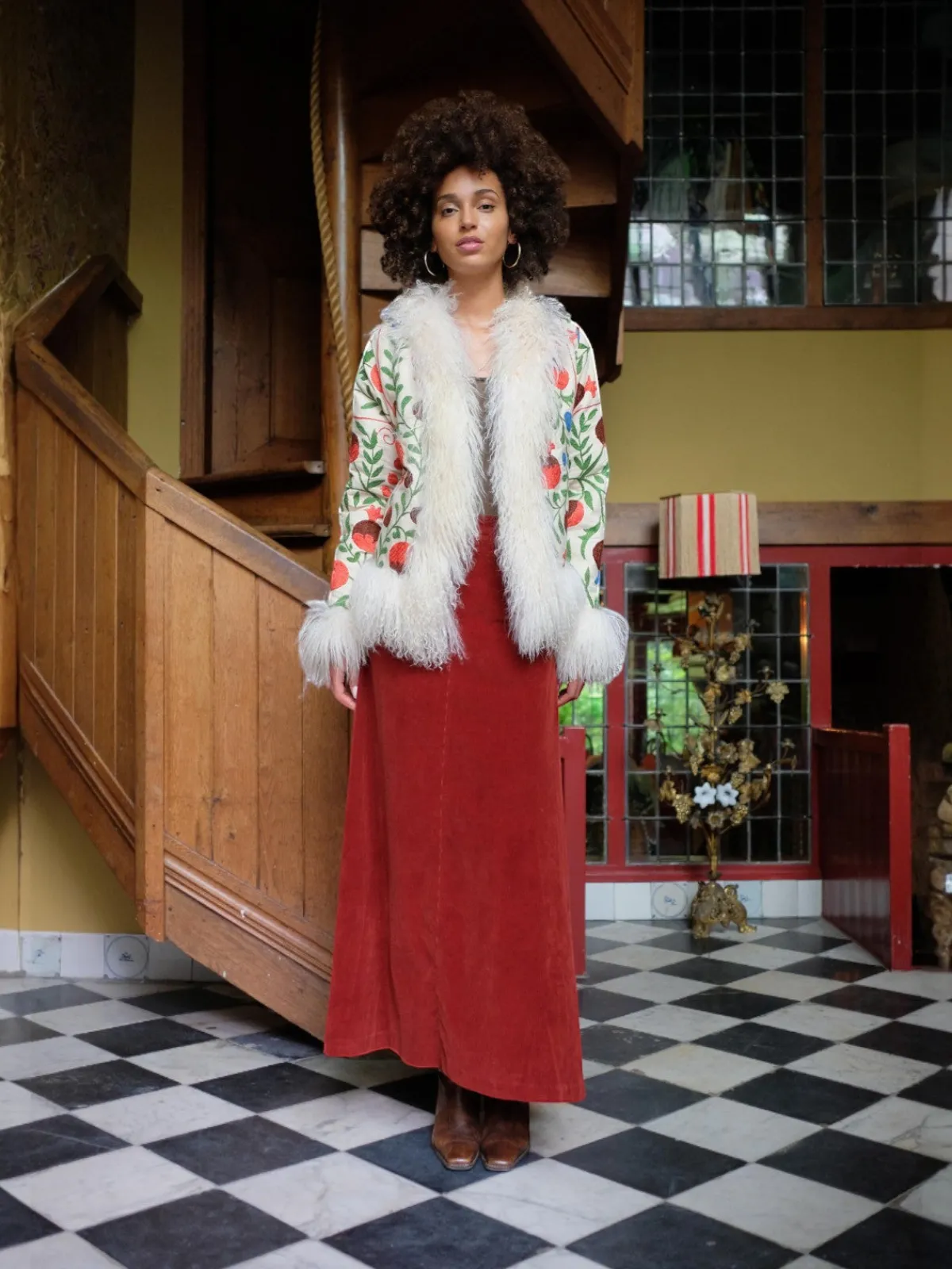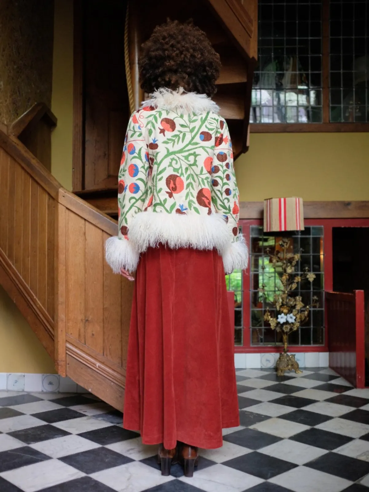 Our ZAZI Zebay Coat evokes the effortless glamour of the 1970s, wrapping elegantly at the waist for a beautifully cinched silhouette. Expertly handcrafted, it features carefully selected vintage Suzani embroidery, seamlessly interwoven with upcycled sheepskin for a rich interplay of texture and heritage. A luxurious fur trim adds the perfect finishing touch, enhancing its warmth and sophistication. Given the vintage nature of the textiles, each coat is entirely one-of-a-kind and only available in the indicated size. Handcrafted by female artisans in Afghanistan.