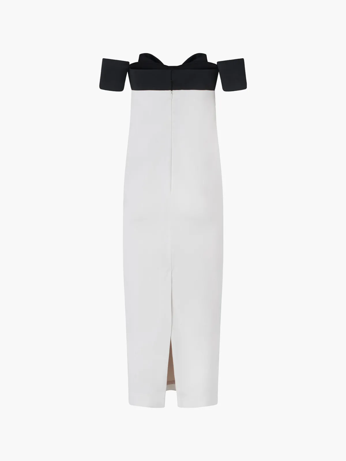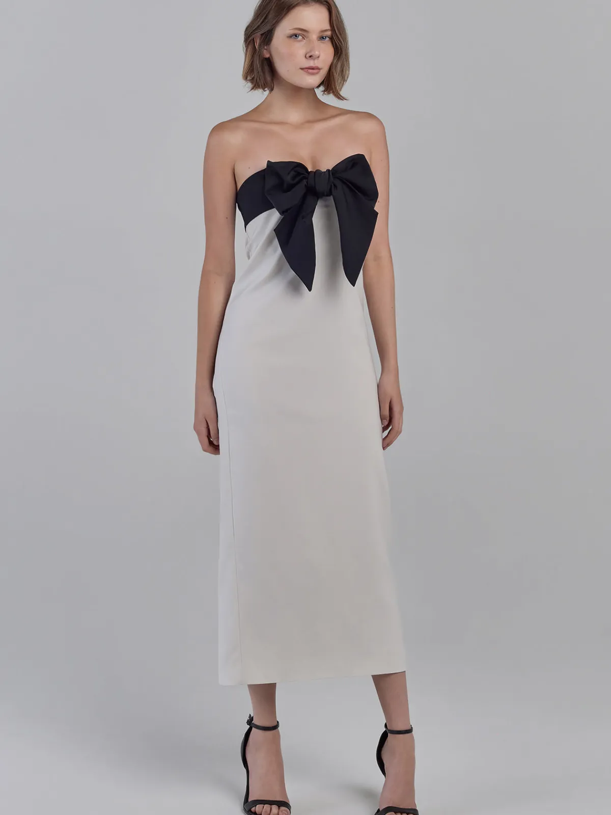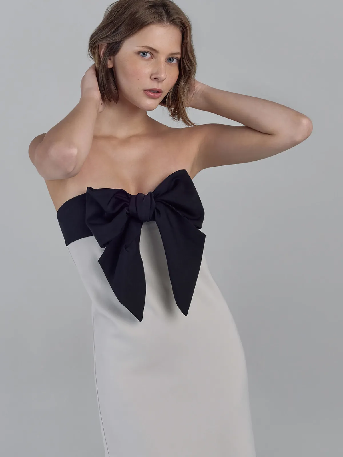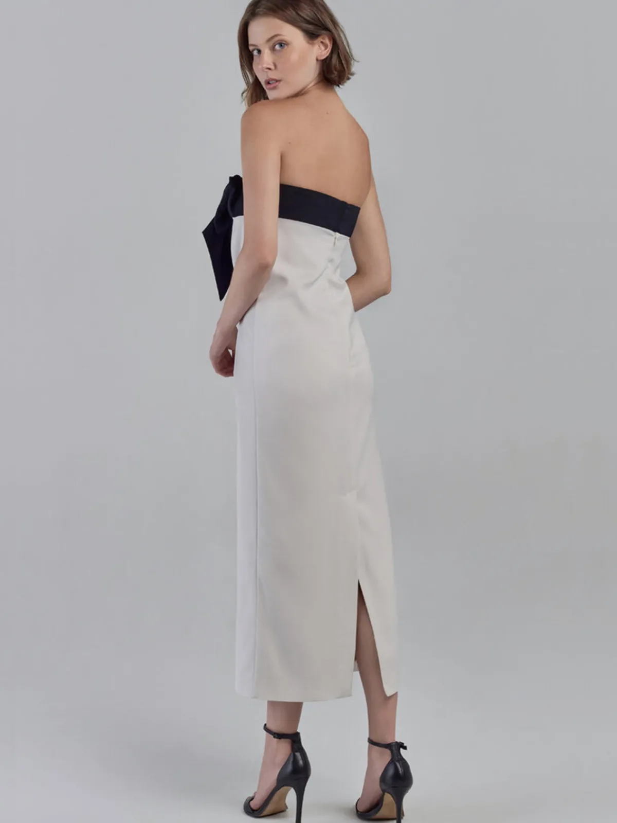 Our Zeta Gwyneth Cocktail Dress features a slender silhouette in a midi length with a strapless bodice and removable straps. It’s detailed with a contrast draped bow at the bust and finished with an invisible side zip closure. Handcrafted by artisans in Bogota, Colombia.