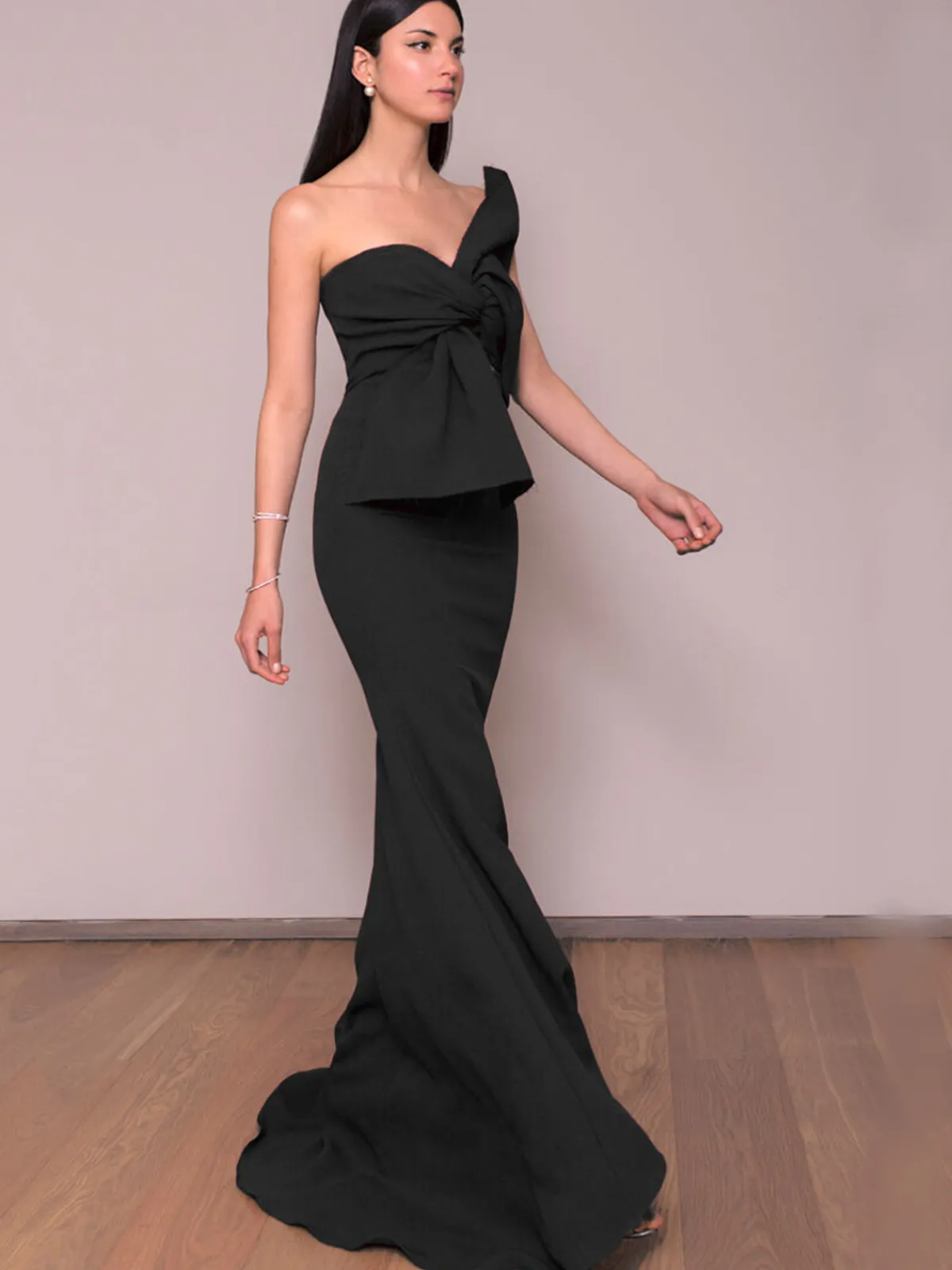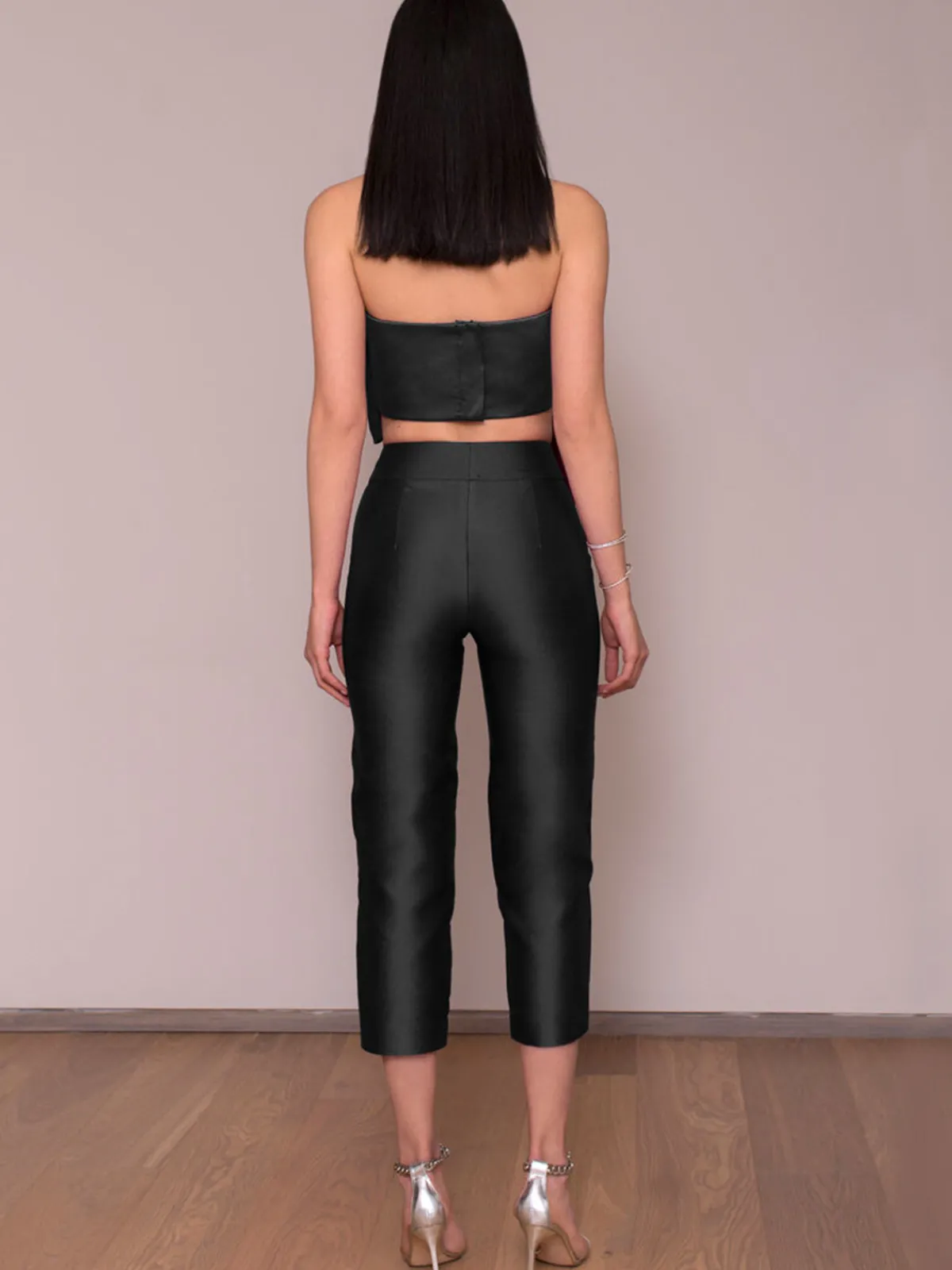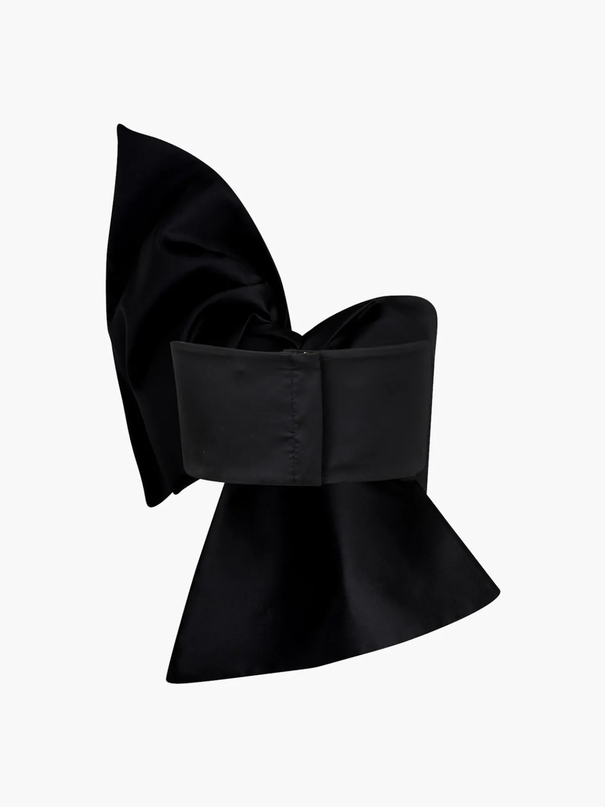 Our Zeta Laso Top in Black features a strapless silhouette with draped detailing, a large bow knot on the chest, and an internal corset that provides and maintains the structure. Finished with an invisible back zipper. Handcrafted by female heads of households in Colombia.