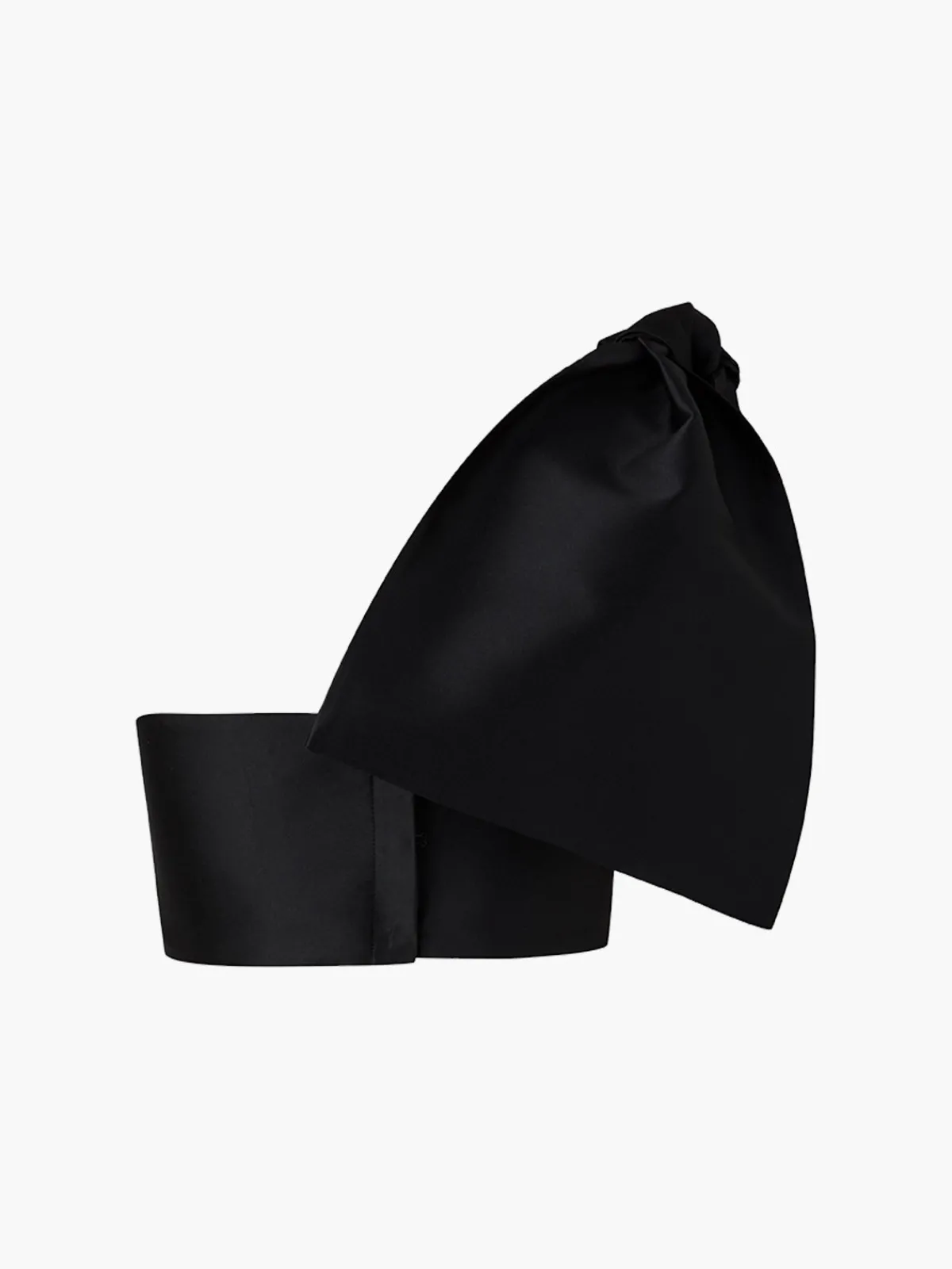 Our Zeta Nyx Top features a cropped silhouette with a large hand draped bow on the shoulder and an invisible back zipper. Handcrafted by female heads of households in Colombia.